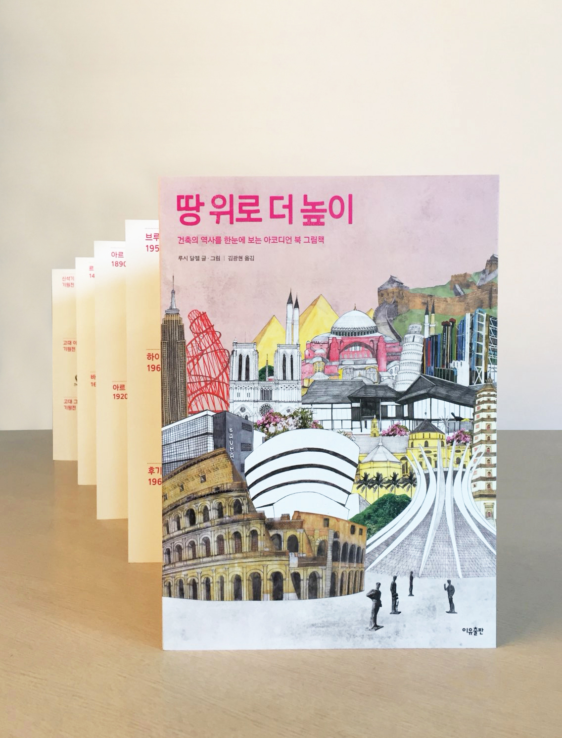 《땅 위로 더 높이》는 인류가 정착 생활을 시작한 신석기 시대부터 오늘날까지 건축의 역사가 한 폭의 파노라마처럼 펼쳐지는 환상적인 그림책이다. 영국의 일러스트레이터 루시 달젤은 탁월한 구성력과 돋보이는 드로잉으로 1만 년이 넘는 건축사를 하나의 화폭 안에 담아 인류 문명의 드라마를 압축적으로 보여 준다. 병풍형식의 제본 방식을 활용해 인류사의 대표적인 건축물들을 시대순으로 볼 수 있으며, 개별 건축물에 대한 정보는 물론 인류 문화사를 관통하는 건축 사상의 흐름과 시대별 분위기를 파악할 수 있다. 뒷면에는 각 시대별 건축 양식에 대한 작가의 글을 담았는데 시대를 넘나드는 생동감 넘치는 해설과 알찬 내용이 독자의 이해를 돕는다. 폭넓은 독자층을 배려한 이 아코디언 북은 감각적인 일러스트레이션과 실속 있는 정보가 특별한 형식에 담긴 건축 역사의 가족 앨범이라 할 수 있다.
