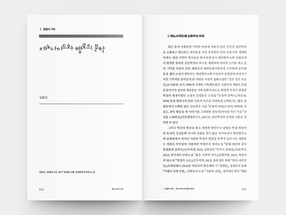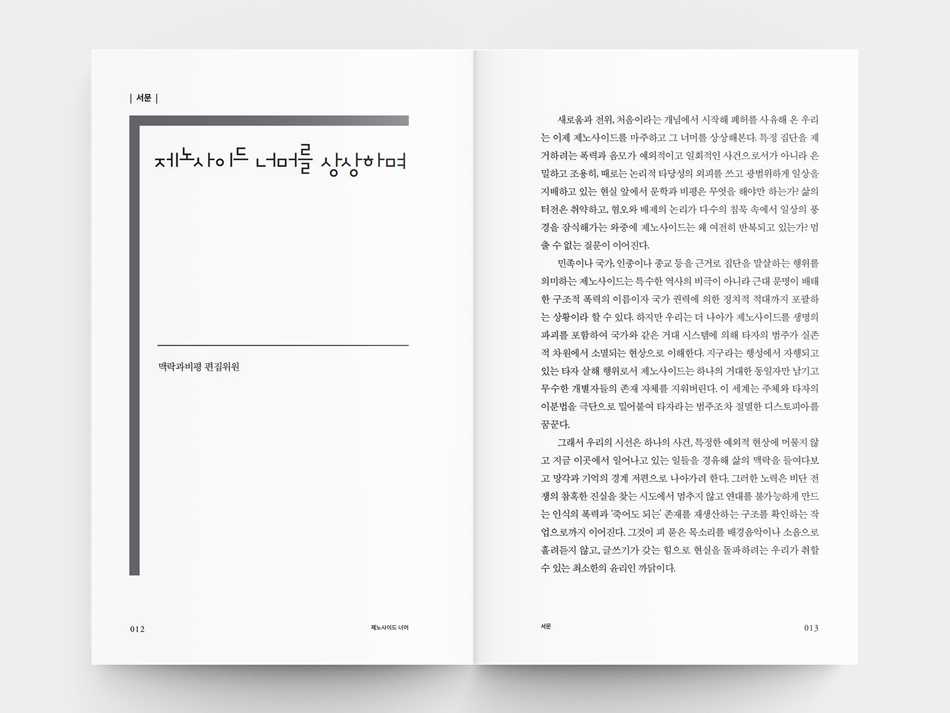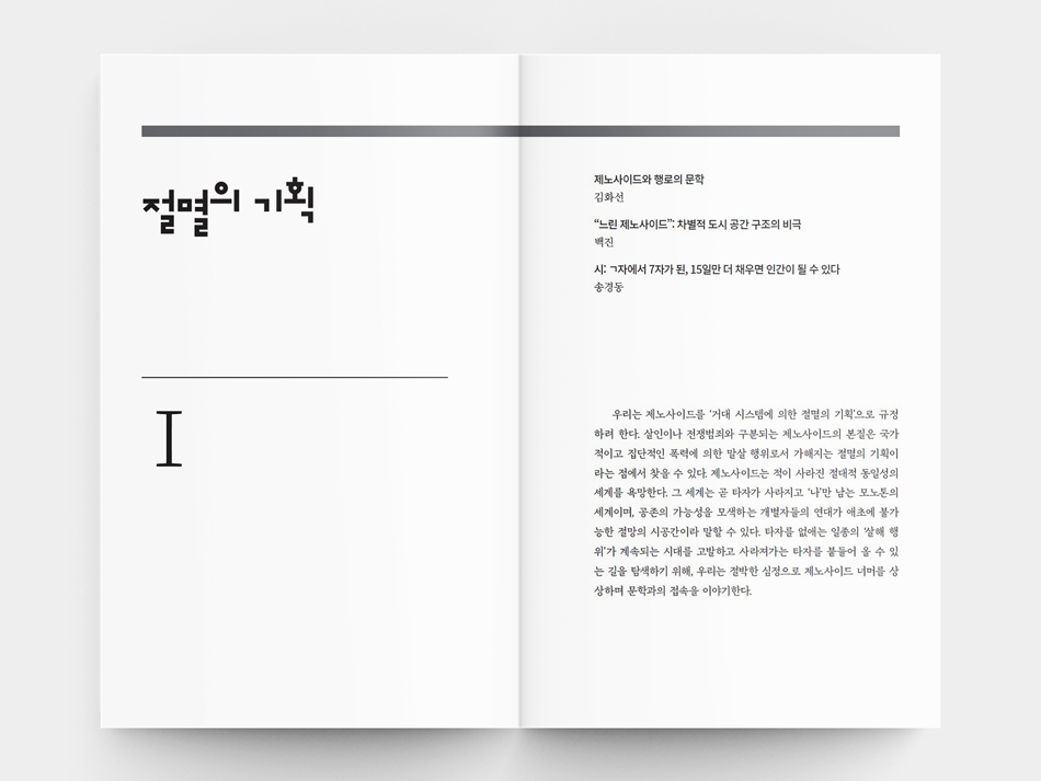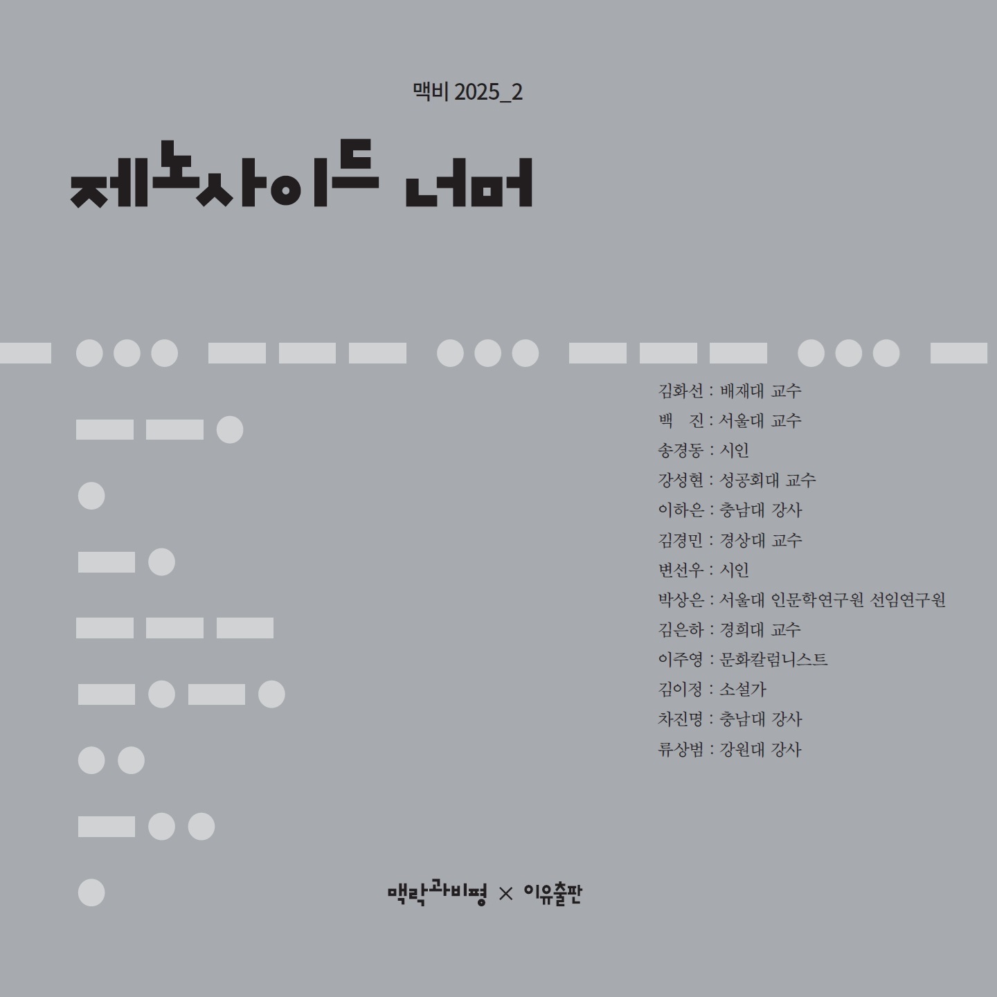 맥락과비평 제2호 제노사이드 너머가 출간되었다. 맨 앞, 처음의 형태(0호, 2023)와 폐허를 말하다(1호, 2024)에 이은 세 번째 간행이다. 제노사이드 너머는 특정 집단을 제거하려는 폭력과 음모가 다양한 양태로 광범위하게 일상을 지배하고 있는 현실 앞에서 문학과 비평은 무엇을 해야만 하는가를 묻고 있다. 이러한 질문에 대한 고민은 ‘제노사이드’와 ‘너머’라는 단어로 응축된다. 제노사이드는 생명의 파괴를 포함하여 국가와 같은 거대 시스템에 의해 타자의 범주가 실존적 차원에서 소멸되는 현상이라 할 수 있다. 오늘날에도 반복적으로 자행되고 있는 타자 살해 행위로서 제노사이드는 하나의 거대한 동일자만 남기고 무수한 개별자들의 존재 자체를 지워버린다. 우리는 이러한 현상의 내면을 응시하고 지금, 여기서 다시 용기 내어 만들어가야 할 길을 찾고자 했다.